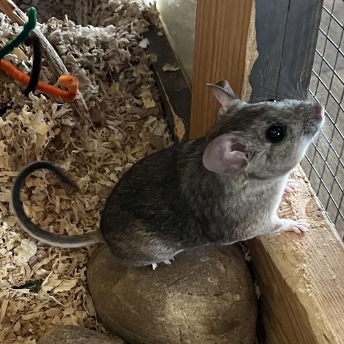 Maddie arrived in February 2023 after living at Weber State University for 4 years. She was born in captivity on April 4, 2019 as part of a study on Woodrat behavior. Her mother was trapped at Lytle Ranch in Utah. Maddie is a true packrat. She has many trinkets and toys in her enclosure which she adds to her pile of substrate.